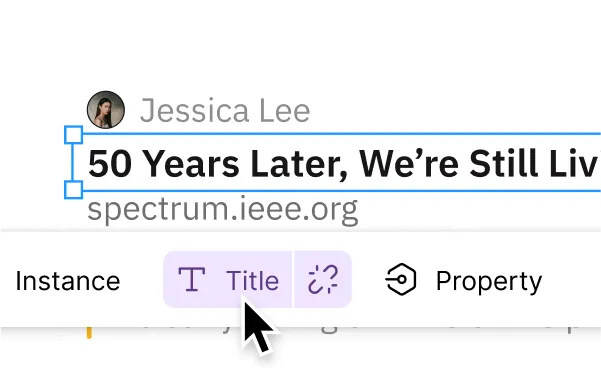 Tell better stories with real data. Sync text, variant properties, component instances and more. Keep all your designs up to date in a click.
